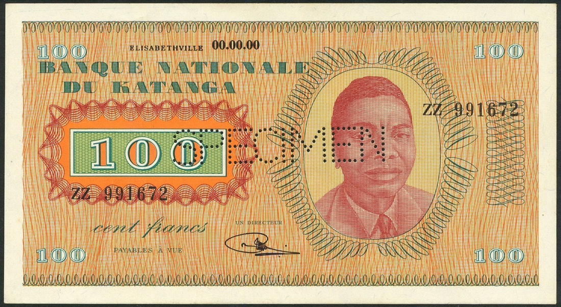 (x) Banque Nationale du Katanga, specimen 100 francs, ND, serial number ZZ 991672, also an issued example dated 31.10.60, with serial number CR 195538, both orange and green, Moise Tshombe at right, value at left