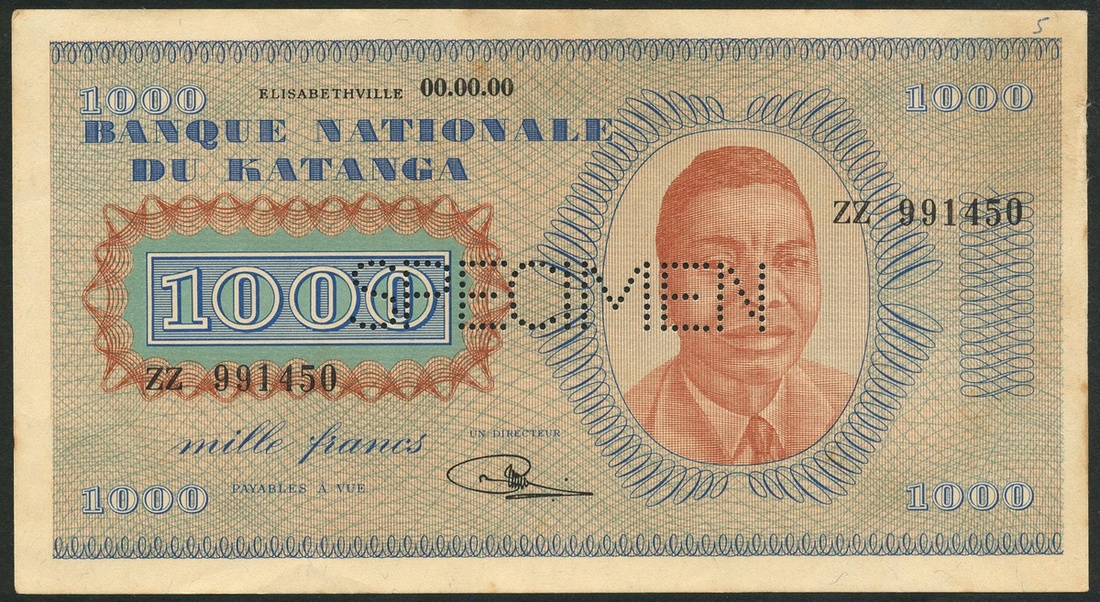 (x) Banque Nationale du Katanga, specimen 1000 francs, ND, serial number ZZ 991450, also an issued example dated 31.10.60, with serial number AA 006576, both blue and pale brown, Moise Tshombe at right, value at left