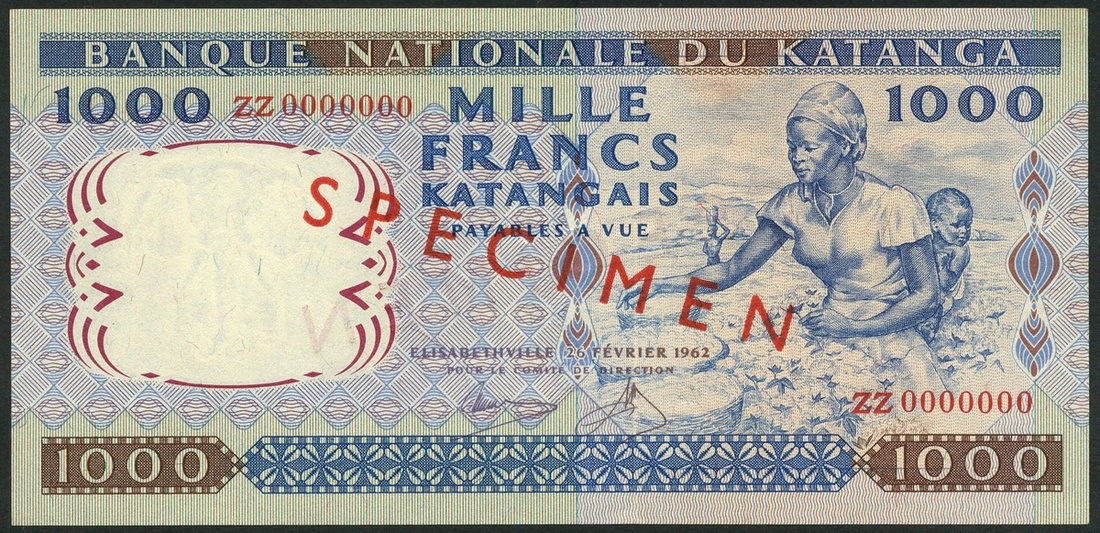 (x) Banque Nationale du Katanga, specimen 1000 francs, 26 February 1962, red serial number ZZ 000000, blue and lilac, woman picking cotton, signatures of Kitambala and Mwilambwe