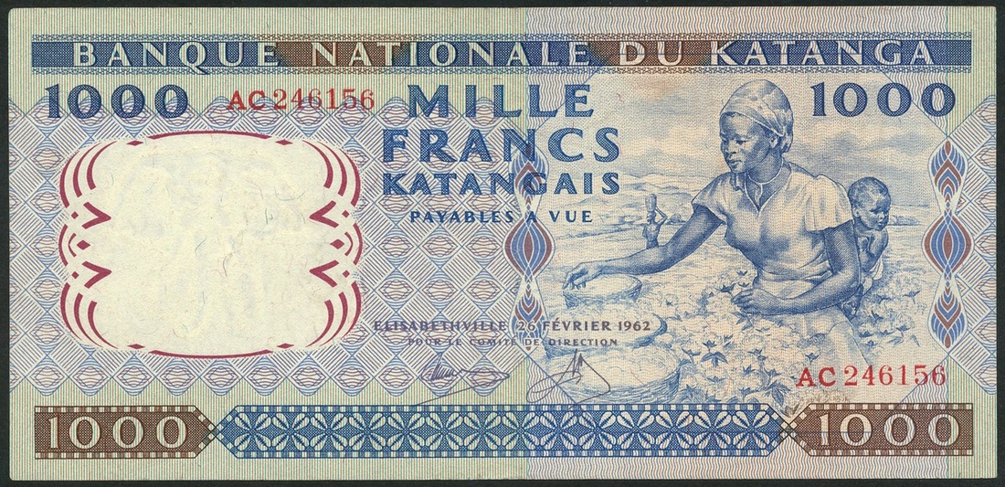 (x) Banque Nationale du Katanga, 1000 francs, 26 February 1962, red serial number AC 246156, blue and lilac, woman picking cotton, signatures of Kitambala and Mwilambwe