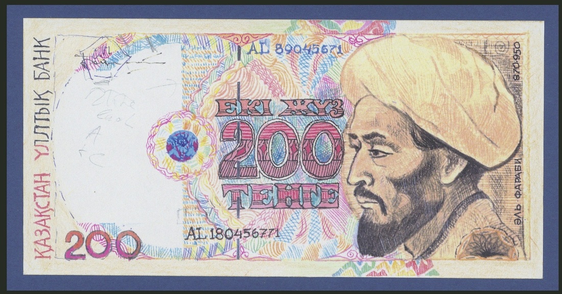 National Bank of Kazakhstan, a specimen 200 tenge of 1993, also a colour reproduction of the note for comparison, two further specimen 200 tenge of 1993, Abu Nasr al Farabi, also a specimen 500 tenge with the same portrait dated 1994