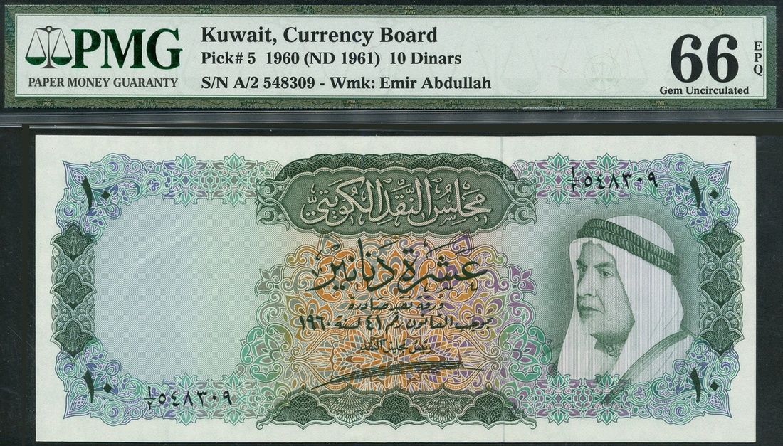 (x) Kuwait Currency Board, a set of the "first" issues of 1961 comprising, 1/4 dinar, serial number A/6 756383, 1/2 dinar, serial number A/3 890454, 1 dinar, serial number A/4 449465, 5 dinars, serial number A/3 453208 and 10 dinars, serial number A/2 548309, brown, purple, reddish brown, blue and green respectively, all feature portrait Sheikh Sabah Al-Salem Al-Sabah at right