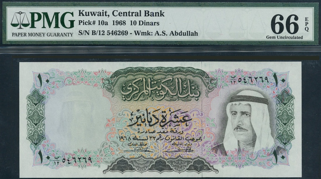 (x) Central Bank of Kuwait, 10 dinars, ND (1968), serial number B/12 546269, green on multicolour underprint, portrait Sheikh Sabah Al-Salem Al-Sabah at right, value in each corner, ornate panel at left and right, reverse, dhow