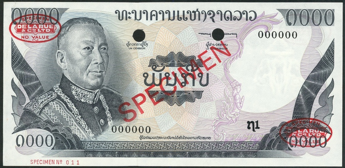(†) Banque Nationale du Laos, specimen 1000 kip, ND (1975), zero serial numbers, black and mauve and white, King Sisavang Vatthana at left, reverse elephant,