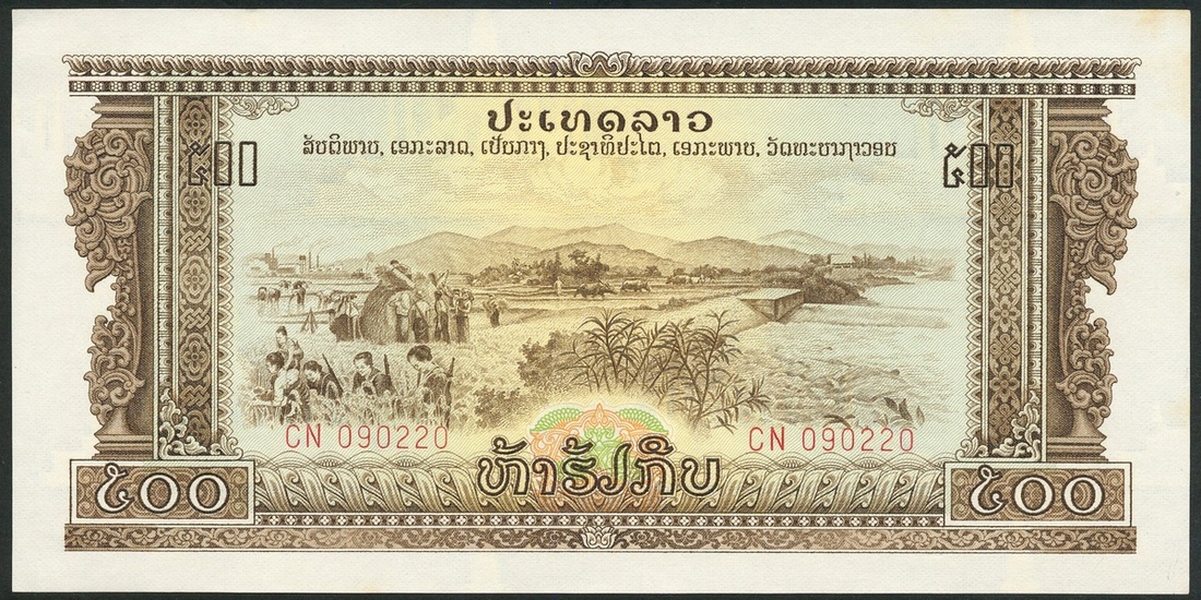 Pathet Lao Government, group 500 kip, 1968 (37), brown on multicolour, farmers harvesting rice in paddy, factory and water buffalo in background, reverse brown on multicolour, soldiers with rifles and anti-aircraft guns