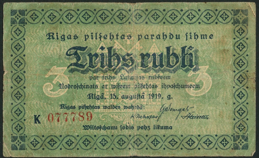 Latvian Government Currency notes, 1 rublis, 1919, blue and orange-brown, 1 rublis (3), 1919, green, 5 rubli, ND (1919), blue, 10 rubli, 1919, brown , also Stadt Riga 1 rublis (2), 1919, brown and 3 rublis, green
