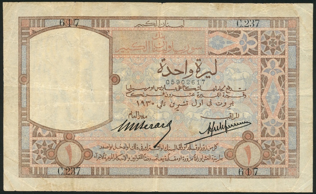 Banque de Syrie et du Grande Liban, Lebanon, 1 livre, 1 November 1930, serial number C.237 617, red, blue and brown, value at low left and right, reverse multicoloured, shoreline scene at left and centre