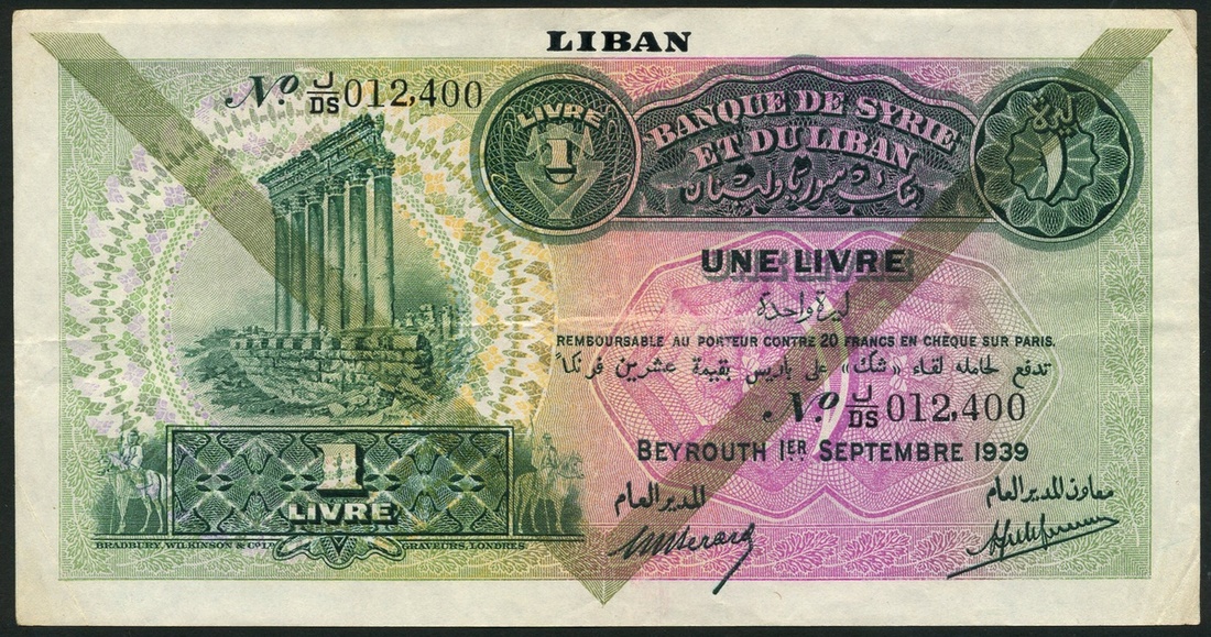 (x) Banque de Syrie et du Liban, Lebanon, 1 livre (2), 1 September 1939, serial numbers J/CM 017930 and J/DS 012400, green on multicolour underprint, Pillars of Baalbek at left, value at low left and top right and centre, first with two diagonal red lines overprint, second with green chevron overprint