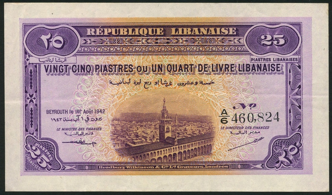 (x) Republique Libanaise, 25 piastres (2), 1 August 1942, serial numbers A/1 574807 and A/6 460824, purple on multicolour underprint, Omayyad Mosque in Damascus at centre, value at corners