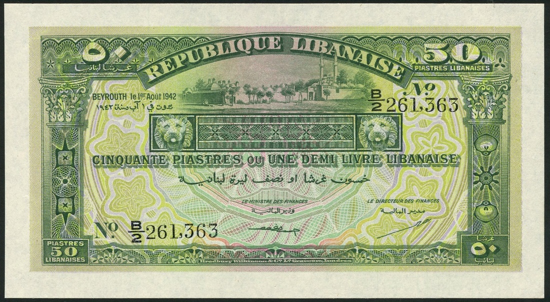 Republique Libanaise, 25 piastres, 1 April 1942, prefix A/2, violet and orange, the Umayyad Mosque in Damascus at centre, 50 piastres, 1 October 1942, prefix B/2, green, Sultanieh and Mosque top centre