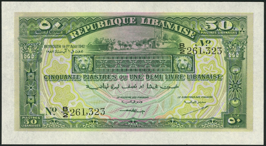 (x) Republique Libanaise, 50 piastres, 1 August 1942, serial number B/2 261323, green on multicolour underprint, view of Damascus at top centre, value at corners