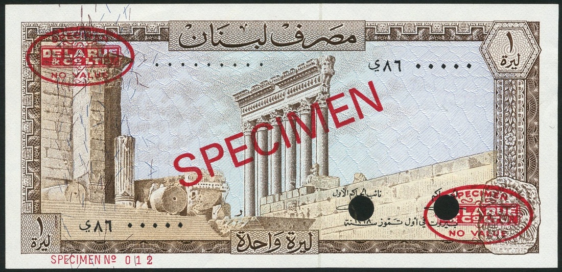 (†) Banque du Liban, specimen 1 livre (7), 1952, 1964, 1968, 1971, 1972, 1973, 1974, 1980, brown, pale blue and yellow, the pillars of Baalbek at centre, also 1 livre, 1955, brown, the castle at Saida at left
