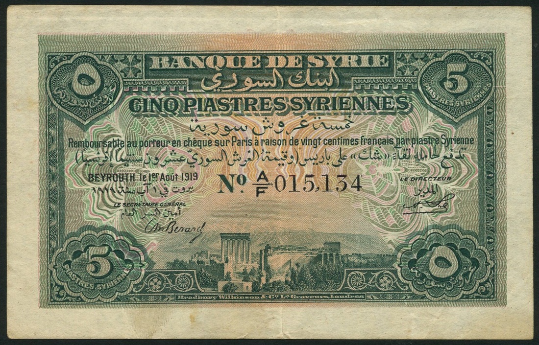 (x) Banque de Syrie, 5 piastres, 1 August 1919, serial number A/F 015134, green on multicolour underprint, Pillars and ruins of Baalbek at low centre, value at corners