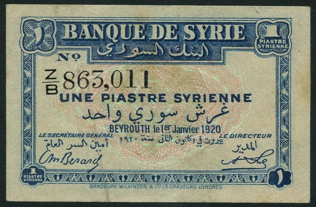 (x) Banque de Syrie, 1 piastre, 1 January 1920, serial number Z/B 863011, blue in pink and green underprint, value at corners, reverse the Pillars of Baalbek at centre
