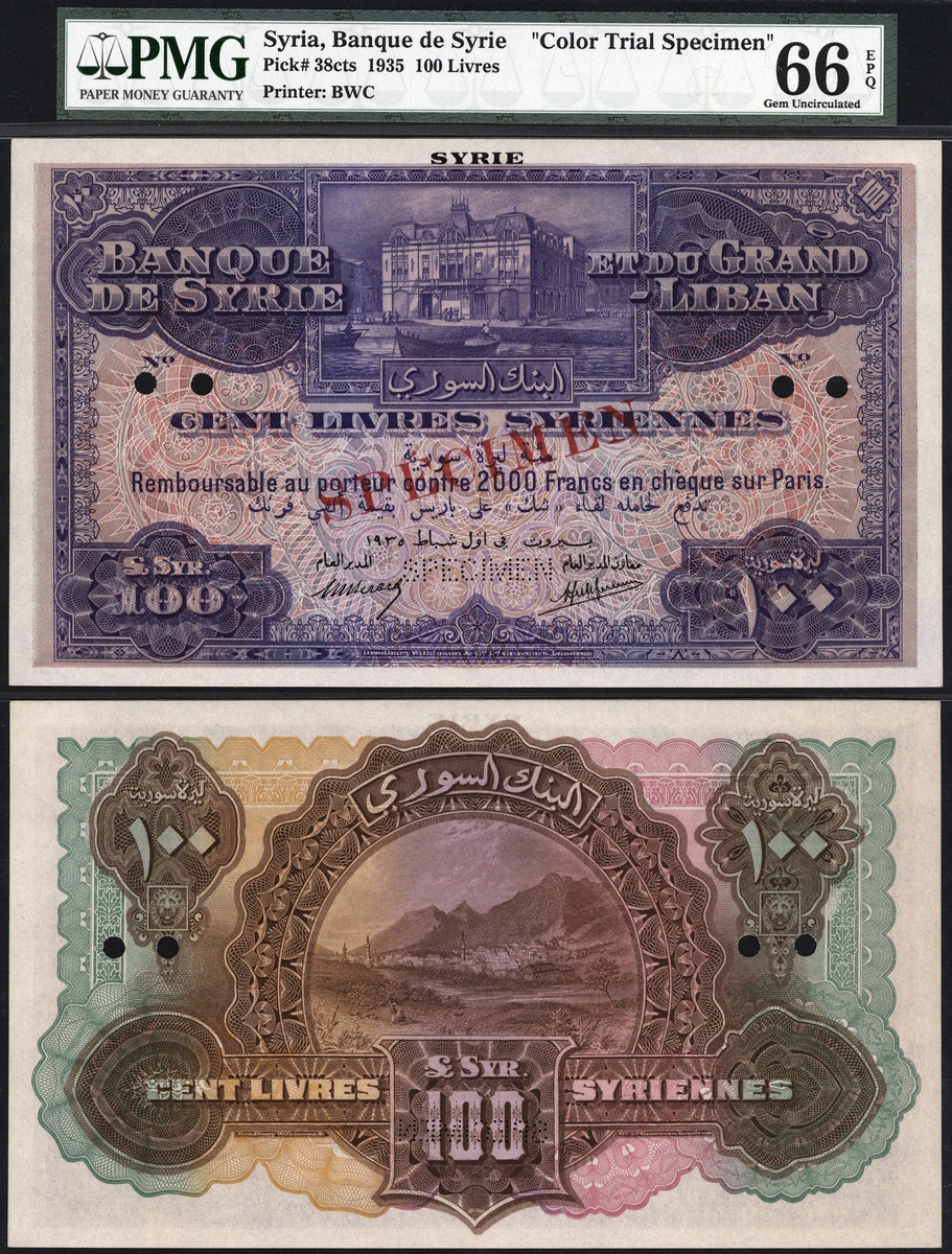 (x) Banque de Syrie et du Grand Liban, Syria, colour trial specimen 100 livres, 1935, purple and multicoloured, bank building top centre, SYRIE in top margin, value low left and right, reverse, multicoloured, city view, value top left and right and below
