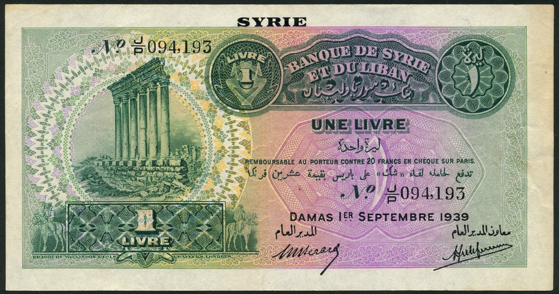 (x) Banque de Syrie et du Liban, Syria, 1 livre (5), 1 September 1939, prefixes J/P, J/BD, J/BE, J/BH, J/BM, green on multicolour underprint, Pillars of Baalbek at left, value at low left, top centre and right, four with two diagonal red lines overprint