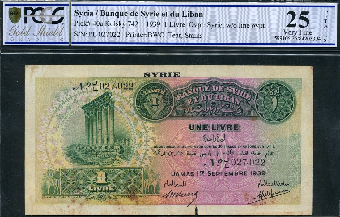 (x) Banque de Syrie et du Liban, Syria, 1 livre, 1939, serial number J/L 027022, green and pink on multicolour underprint, pillars of Baalbek at left, bank title flanked by value in circular frames top centre right, reverse, red on pale green and orange underprint