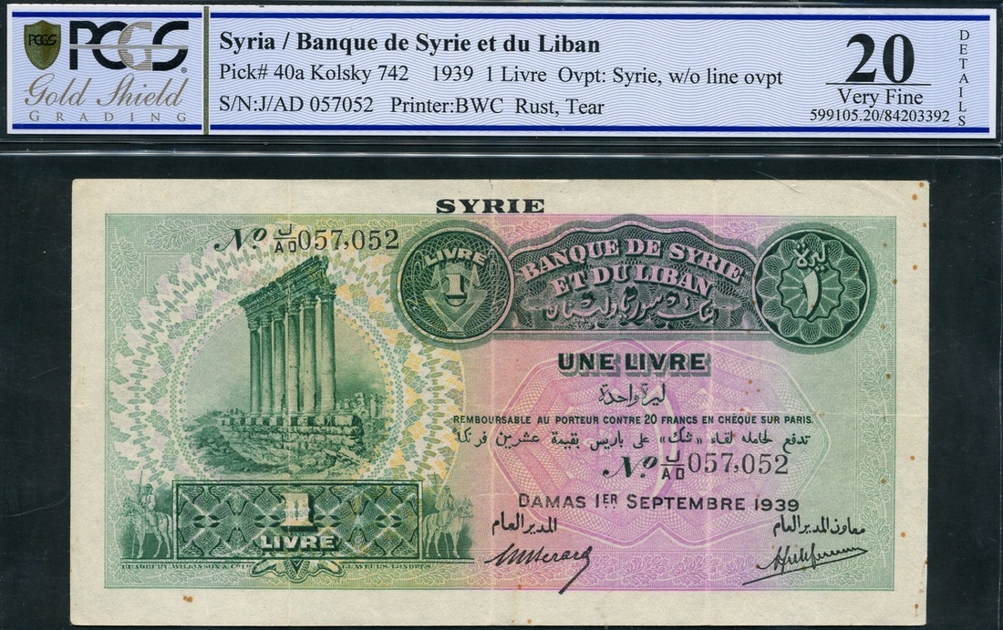 (x) Banque de Syrie et du Liban, Syria, 1 livre, 1939, serial number J/AD 057052, green and pink on multicolour underprint, pillars of Baalbek at left, bank title flanked by value in circular frames top centre right, reverse, red on pale green and orange underprint