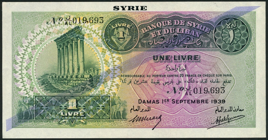 Banque de Syrie et du Liban, Syria, 1 livre, 1939, serial number J/AL 019693, green and pink on multicolour underprint, pillars of Baalbek at left, bank title flanked by value in circular frames top centre right, type A overprint, violet diagonal line, reverse, red on pale green and orange underprint