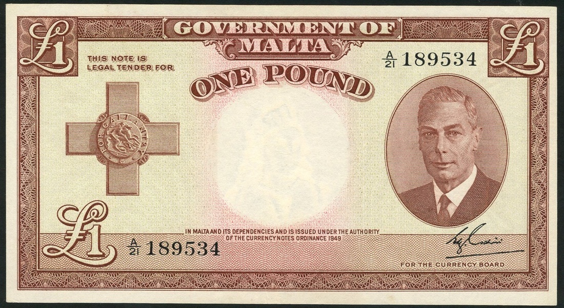 (x) Government of Malta, £1, ND (1951), serial number A/1 189534, brown and pale green, portrait King George VI at right, George Cross at left, bank title top centre