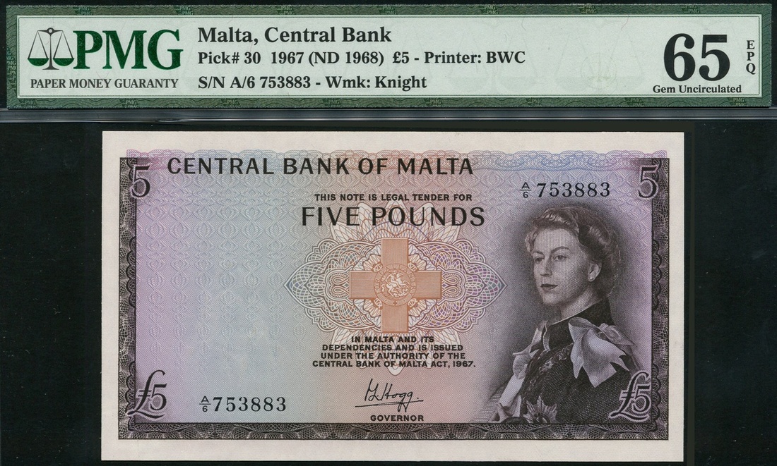 (x) Central Bank of Malta, 10 shillings, £1 and £5, ND (1967), prefixes A/1, A/7 and A/6, red, olive-green and brown respectively, Elizabeth II at right, George Cross at centre, value at corners