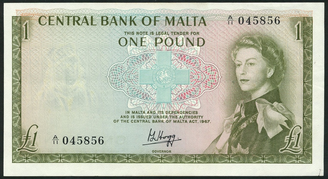 Central Bank of Malta, £1 (2), ND (1969), serial numbers A/11 045856/857, olive and multicoloured, Queen Elizabeth II at right, George Cross at centre, Hogg signature, reverse olive, a view of Marsa