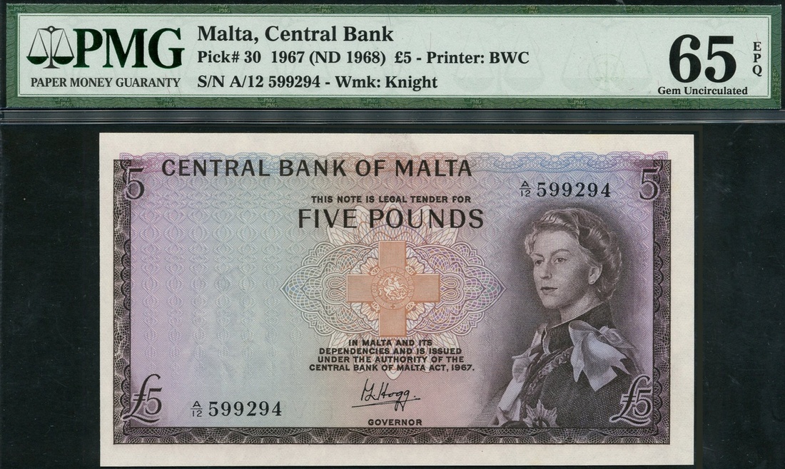 (x) Central Bank of Malta, £5 (2), ND (1961), serial numbers A/8 479693 and A/12 599294, purple and brown, portrait Queen Elizabeth II at right, George Cross at centre, value in each corner and top centre, reverse, Grand Harbour