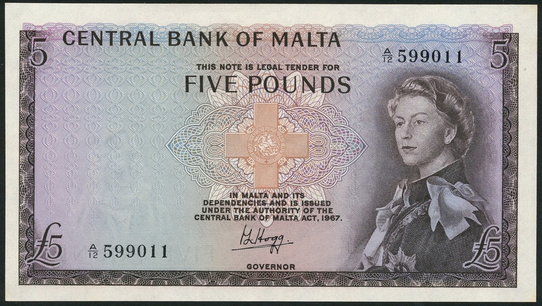 Central Bank of Malta, £5, ND (1968), serial number A/12 599011, dark brown on multicolour underprint, portrait Queen Elizabeth II at right, George Cross at centre, value in each corner and top centre, Hogg signature, reverse, Grand Harbour