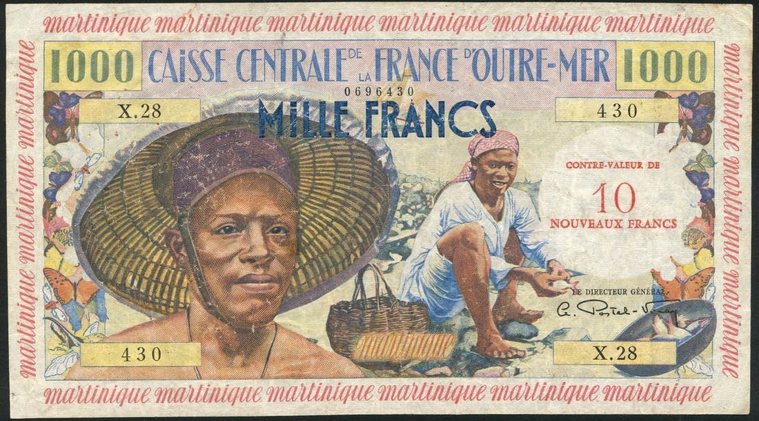Caisse Centrale de la France d'Outre-Mer, Martinique, 10NF on 1000 francs, 'Pecheur', ND (1955), serial numbers X.28-430, blue and multicoloured, fishermen, Postel-Vinay signature, MARTINIQUE in red in borders around, red overstamp 'CONTRE-VALEUR DE 10 NOUVEAUX FRANCS' at right, reverse multicoloured, woman with basket of fruit, banana tree at right