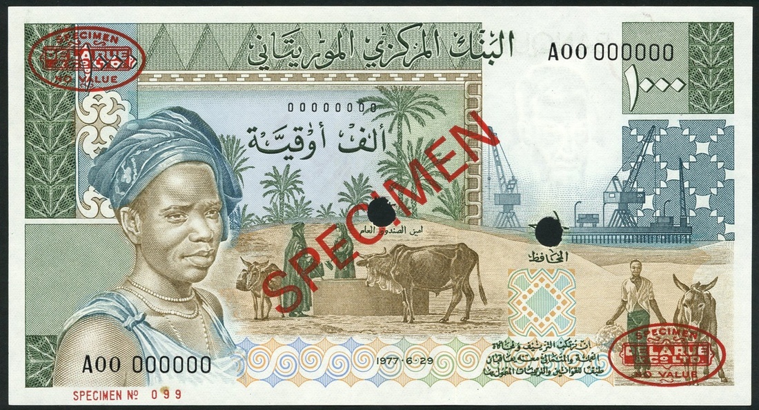 (†) Banque Centrale de Mauritanie, specimen 100 ouguiya, 28 November 1975, serial number A00-000000, blue and multicoloured, man in turban at left, two women with tea at centre, bush at right, also a specimen 200 ouguiya, 29 June 1977, serial number A00-000000, purple and multicoloured, man at left, camel at centre, woman at right and a specimen 1000 ouguiya, serial number A00 000000, 29 June 1977, green and blue, woman at left in turban, cattle at well at centre