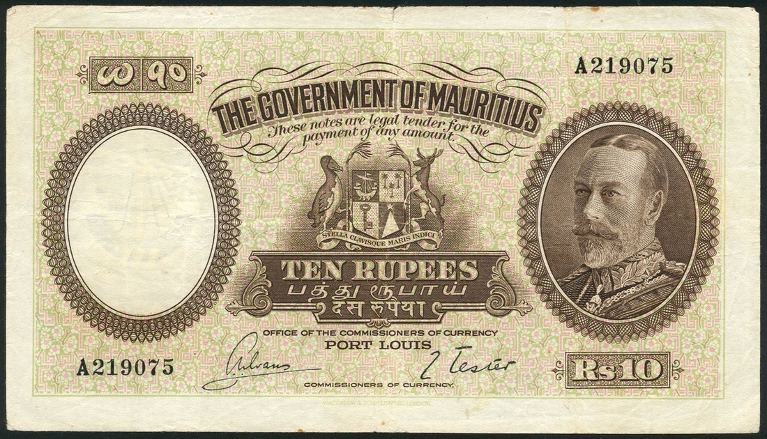 Government of Mauritius, 10 rupees, ND (1930), serial number A 219075, brown, pale green and lilac, George V at right, arms at centre, reverse brown and white, bank title and value