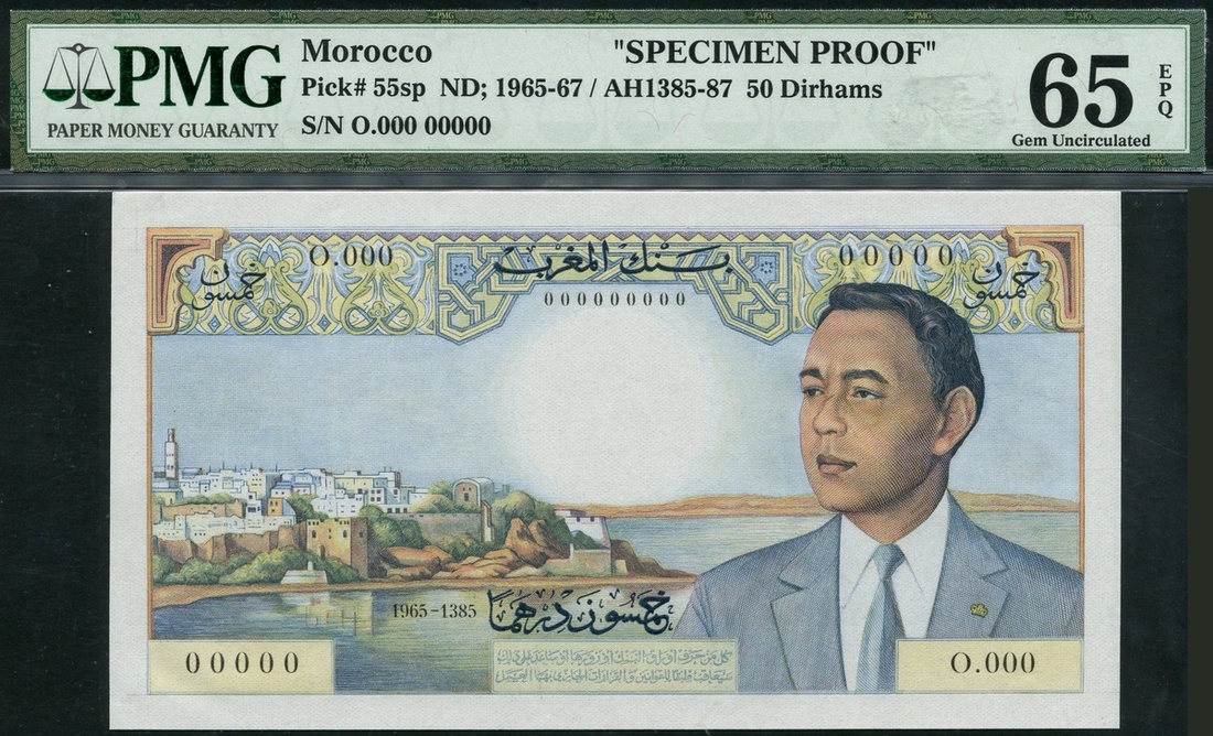 Banque du Maroc, an obverse and reverse uniface specimen 50 francs, ND (1965-1967), zero serial numbers, pale blue and multicoloured, King Hassan II at right, view of Rabat, reverse miners and shovel