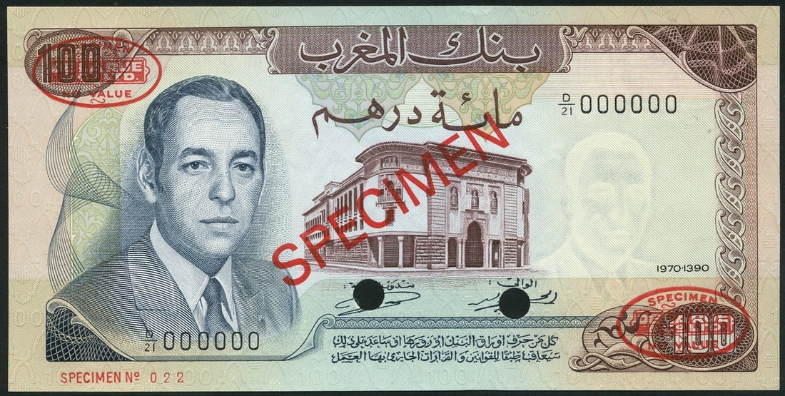 (†) Banque du Maroc, specimen 100 Dirhams (7), 1970, all 000000 serial numbers, prefixes D/1, D/21, D/46, D/77, DA/28, DA/68, DB/94 and one example dated 1985 with prefix DC/45, all brown and pale green and blue, King Hassan II at left, all signature of El Mdaghri and El Alaovi except the last with Lukash and Bel Nani signatures, reverse oil refinery
