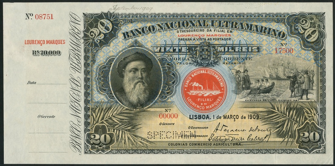 (†) Banco Nacional Ultramarino, Mozambique, printer's archival specimen 20 Mil Reis, 1 March 1909, with counterfoil, serial number run 00000-17500, signatures of black on yellow and blue underprint, portrait of Vasco da Gama at left, his embarkation at right, red steamship Seal Type 1 at lower centre, red overprint LOURENCO MARQUES at upper centre, reverse orange-red, woman seated on anchor looking out at ships