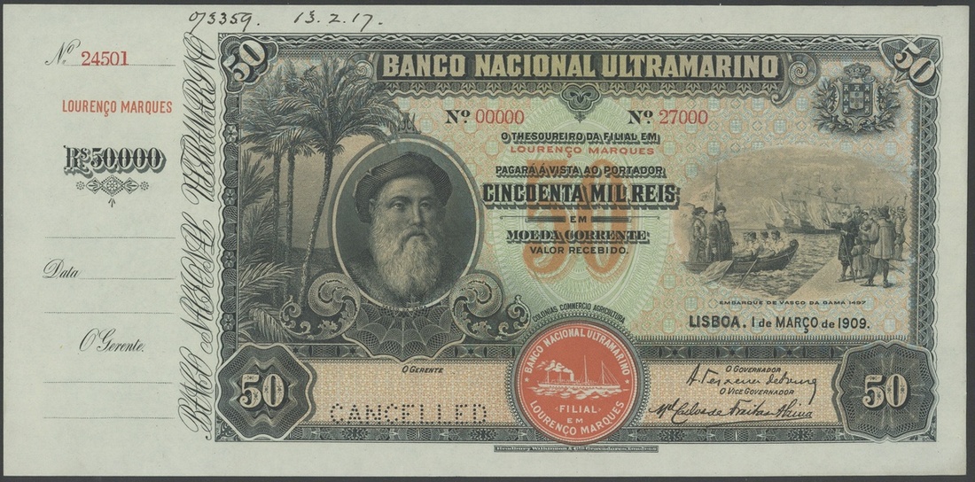 (†) Banco Nacional Ultramarino, Mozambique, printer's archival specimen 50 Mil Reis, 1 March 1909, with counterfoil, serial number run 00000-27000, signatures of black on yellow and blue underprint, portrait of Vasco da Gama at left, his embarkation at right, red steamship Seal Type 1 at lower centre, red overprint LOURENCO MARQUES at upper centre, reverse orange-red, woman seated on anchor looking out at ships