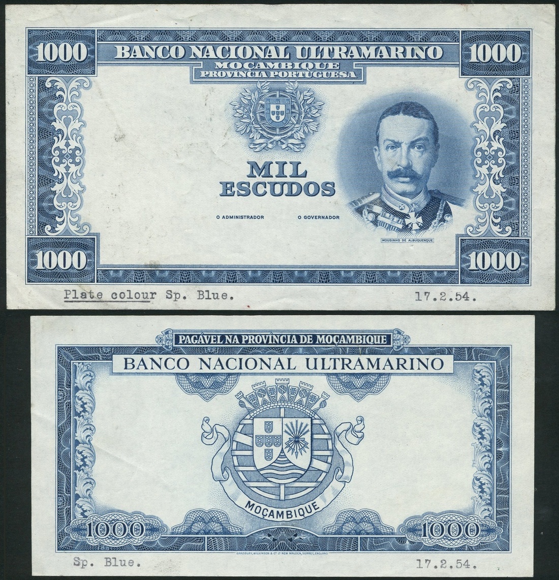 Banco Nacional Ultramarino, Mozambique, obverse and reverse die proof 1000 escudos, ND (1954), blue print, value in each corner, arms at top centre Mousinho de Albuquerque at right, reverse blue print, detailed border, arms at centre