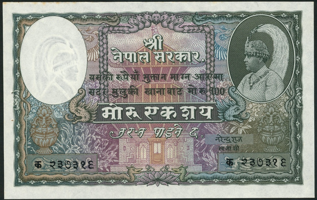 Government of Nepal, 5 rupees (2), ND (1952), purple, Pandit signature, 100 rupees (2), ND (1953), purple, Pandit signature, all King Tribhuvan in plumed helmet at right