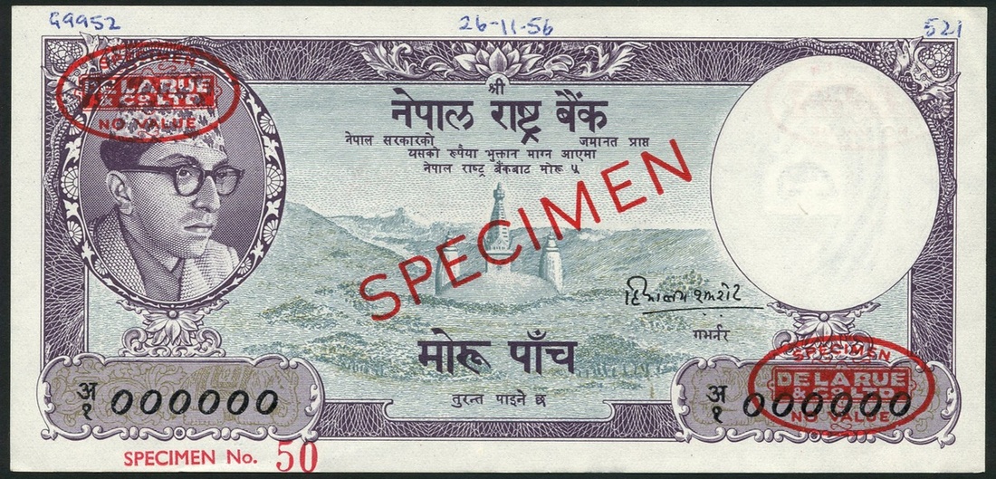 (†) Nepal Rastra Bank, specimen 1 rupee (8), 1960, 1971 (2), 1974 (2), 1979, 1986, first pink and green, second grey-brown, last type blue, King Birendra at left, also specimen 5 rupees (4), 1960, 1962-1968 (3), vilet, all King Mahendra at left wearing doura and coat