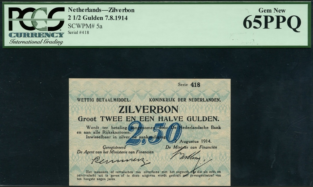 Koninkrejk der Nederlanden, Zilverbon, 2 1/2 gulden, 7 August 1914, series 418, uniface, black with blue underprint, value at centre
