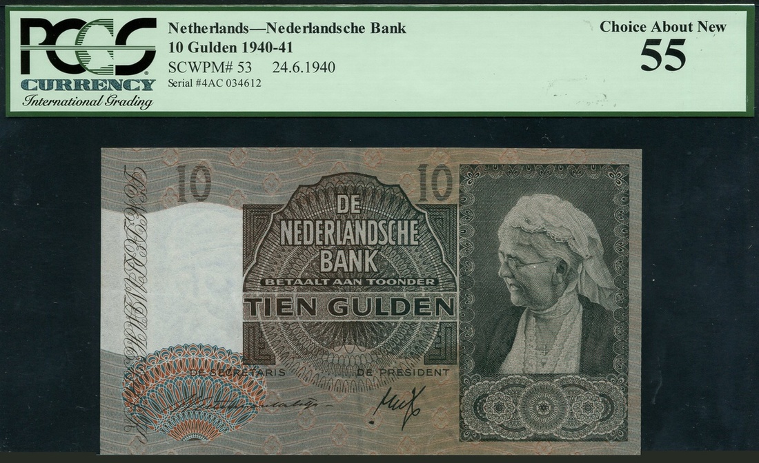 De Nederlandsche Bank, 10 gulden, 24 June 1940, serial number 4AC 034612, brown, dark green and tan, Queen Emma at right, value at centre and top left and right, reverse multicolour, arms at centre