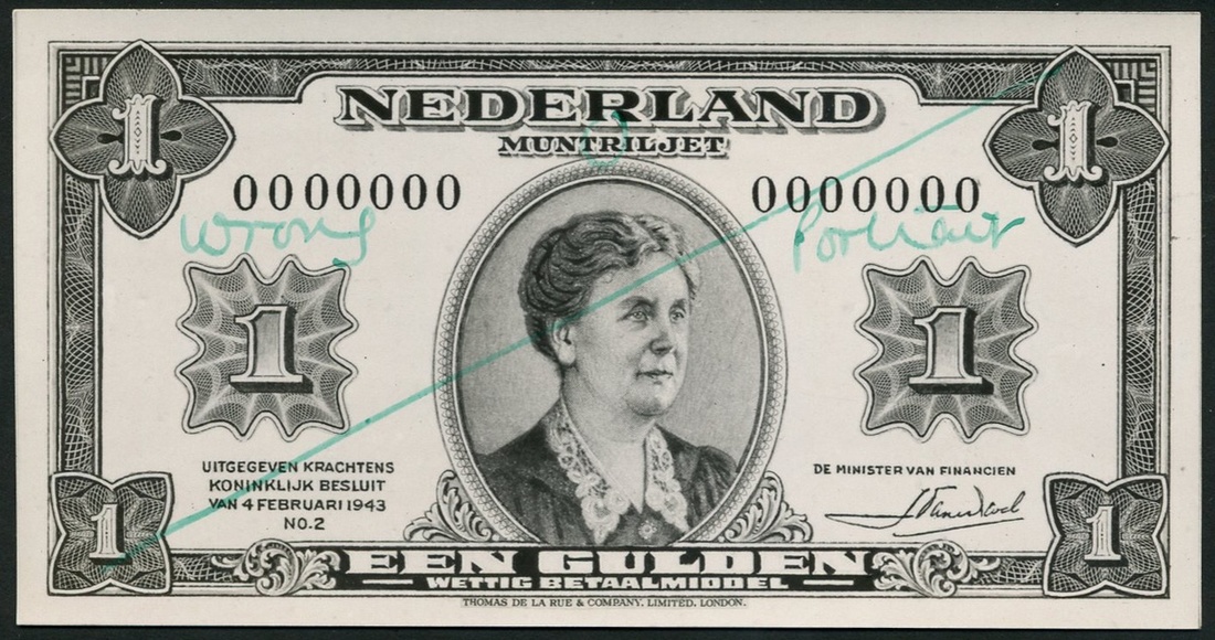 (†) Nederlands Muntbiljet, a group of archival photographs of the obverse and reverse of a proposed issue of 1 gulden with annotation 'wrong portrait', an obverse and reverse 2 1/2 gulden and an obverse only photograph for a 1 and a 2 1/2 gulden, ca 1945, all with Queen Wilhelmina portrait, also a photograph of a reverse for a Nederlandsche Bank 10 gulden and an obverse and reverse photograph for a 20 gulden, type of 1945, Stadhouder portrait