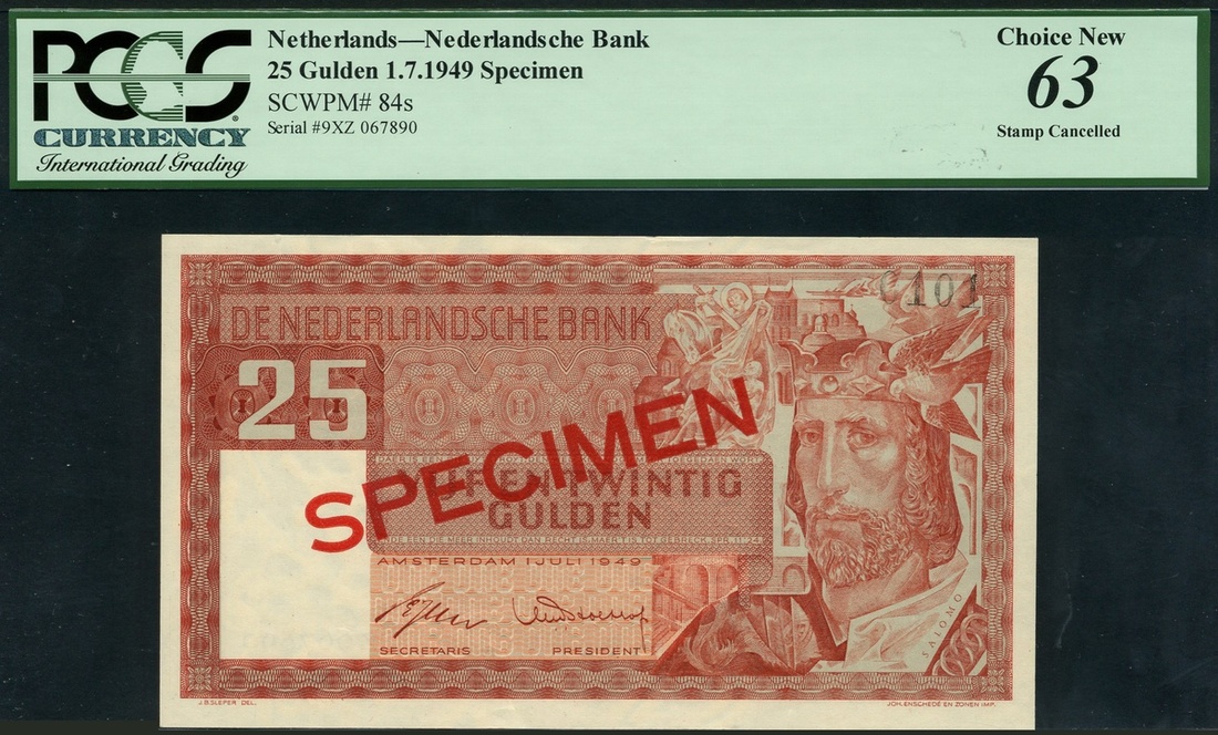 De Nederlandsche Bank, specimen 25 gulden, 1 July 1949, serial number 9XZ 067890, red and orange, King Solomon at right, value at left, red SPECIMEN overprint, and black specimen number 0101 at top right