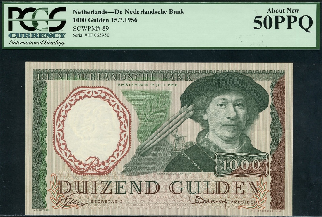 De Nederlandsche Bank, 1000 gulden, 15 July 1956, serial number EF 065950, brown and green, Rembrandt at right, value at low right, reverse multicoloured, hand with palette and brush at left