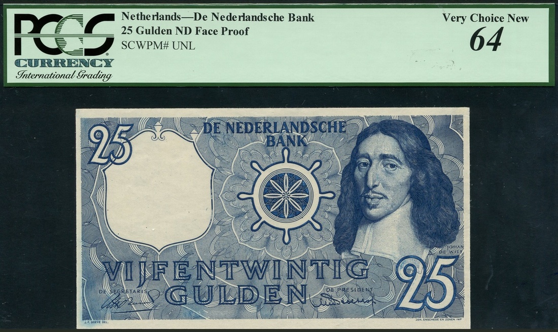 De Nederlandsche Bank, obverse trial for 25 gulden, 1963, no serial number, blue, Johan de Witt at right, ships wheel at centre, value at top left and low right