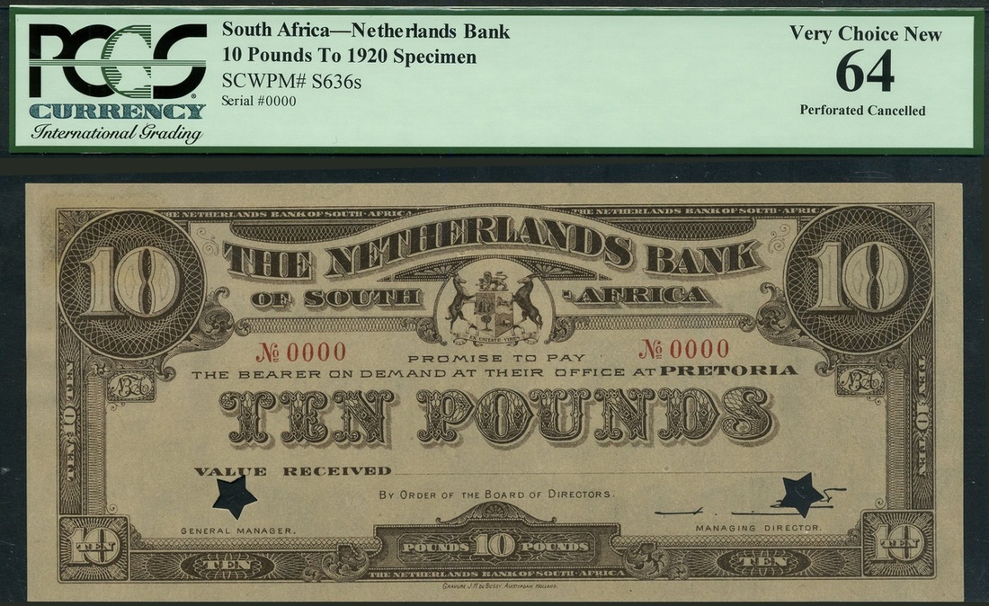 The Netherlands Bank of South Africa, proof/specimen set comprising 10/-, £1, £5 and £10, ND (c1920), serial numbers 0000, dark red, dark green, black and brown respectively, arms at top centre, value at centre and each corner, star shaped cancellation holes, English text