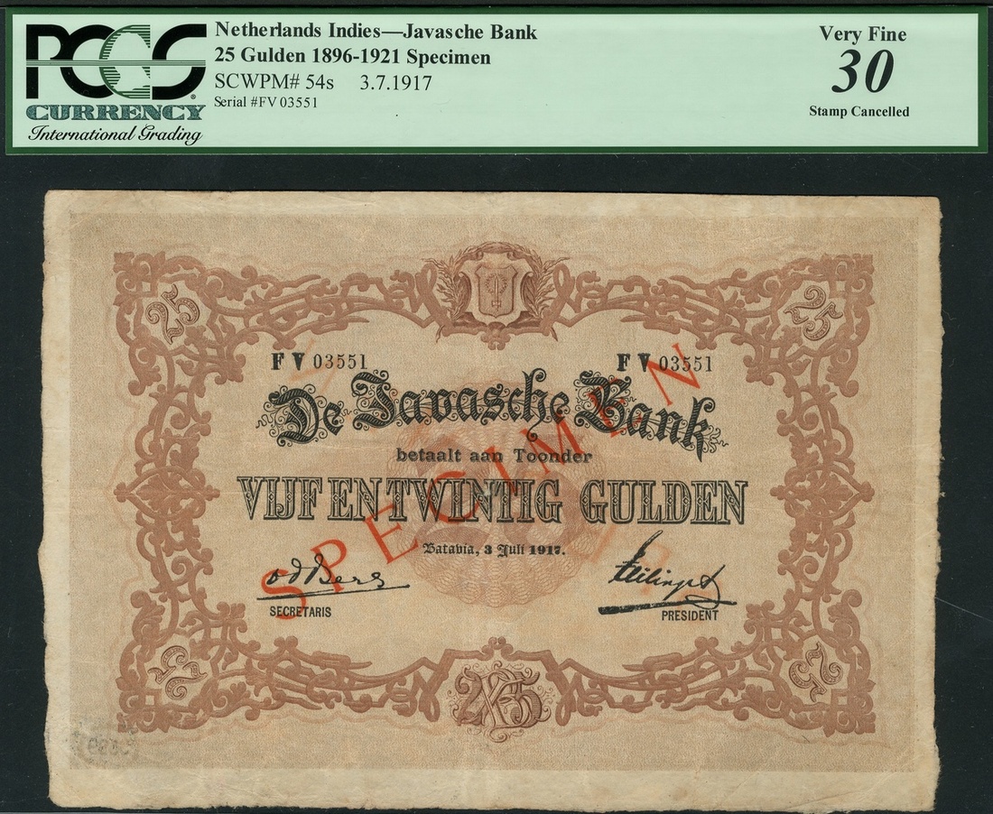 De Javasche Bank, specimen 25 gulden, 3 July 1917, serial number FV03551, black and brown, arms at top centre, value at low centre and corners, red SPECIMEN overprint