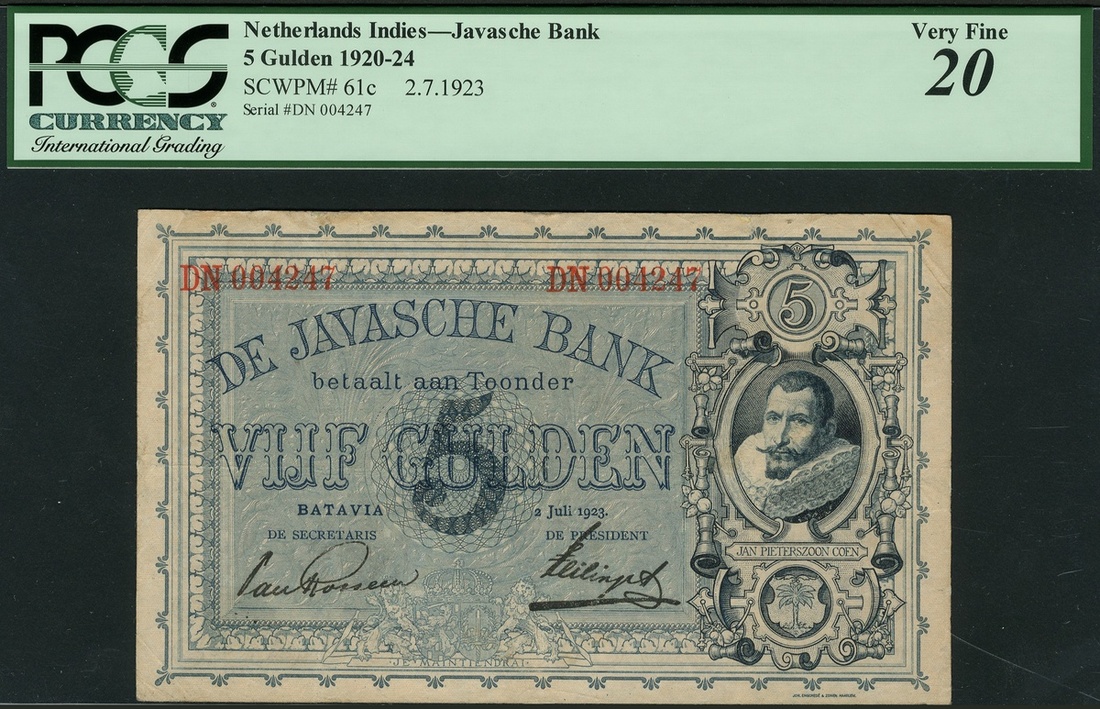 De Javasche Bank, 5 gulden, 2 July 1923, serial number DN004247, blue, Jan Pieterzoon Coen at right, arms at low right, value at centre and top right