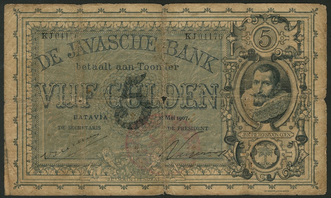 (x) De Javasche Bank, Netherlands East Indies, 5 gulden, 1907, prefix KJ, blue, Coen at right, Netherlands Indies, Muntbiljet, 1920, 1/2 gulden, prefix CW, De Javasche Bank, 25 gulden, 1935, 5 and 25 gulden, 1946