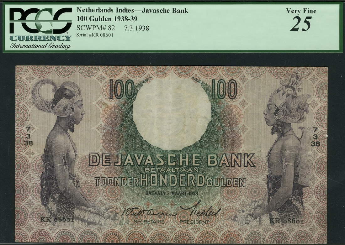De Javasche Bank, 100 gulden, 7 March 1938, serial number KR08601, purple on orange and blue underprint, male Javanese dancers at left and right, values at upper centre