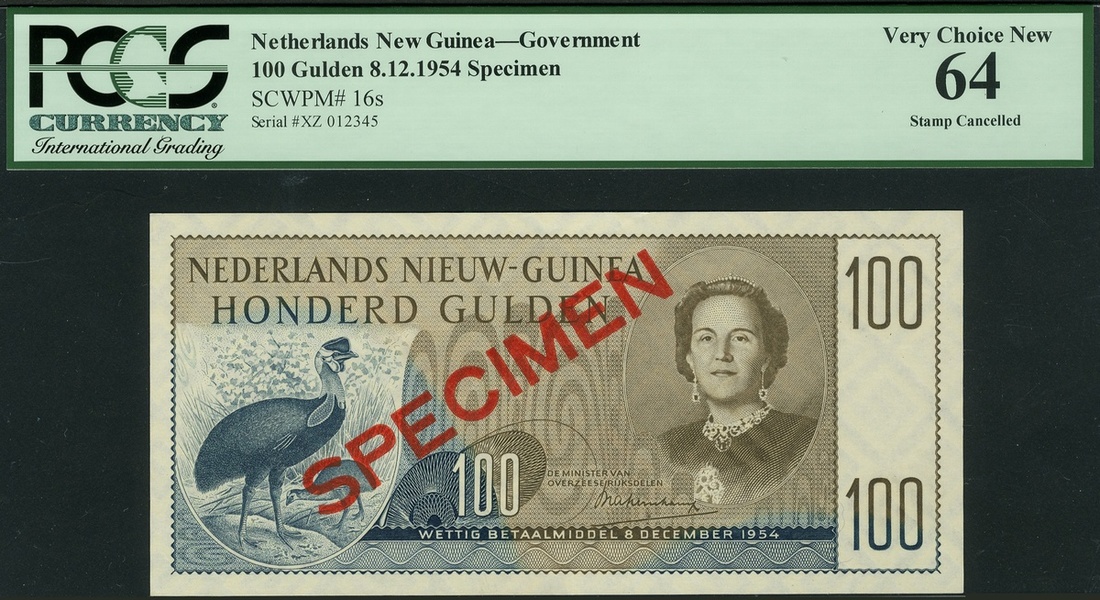 Netherlands New Guinea, specimen 10, 25 and 100 gulden, 8 December 1954, all with serial numbers ZX012345 and ZX067890, purple and green, purple and brown, and blue and brown respectively, Queen Juliana at centre right, first two with sicklebill at left, third with Cassowary at left, value at low centre and upper and lower right, all with red SPECIMEN overprint